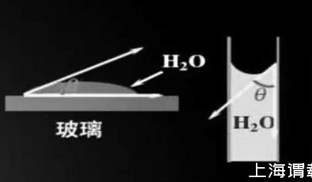 在實(shí)際工作中,通常會用到接觸角結(jié)合γg-l氣-液界面張力來判斷鋪展過程是否自動進(jìn)行。接觸角,是指在固相、液相、氣相這三相的交界點(diǎn),兩個(gè)界面張力(氣-固界面與氣-液界面)之間的夾角,通常用θ表示。如圖1,將水滴滴到玻璃上,接觸角如圖所示。