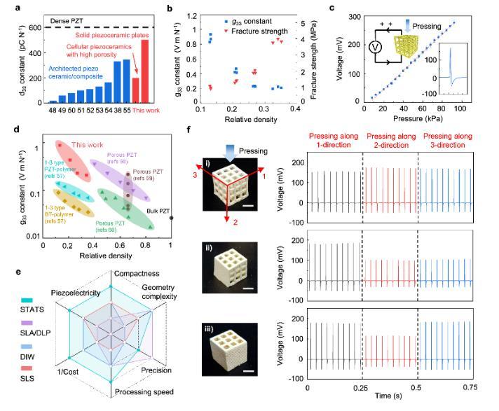 為進一步闡述所開發的STATS制造工藝的優異性,研究團隊制備了一系列經過三維結構設計的多孔壓電陶瓷,并對其機械性能和壓電性能進行了表征(圖2)。STATS法加工的多孔壓電陶瓷具有整體多孔但局部致密的特點,即使在相對密度(多孔陶瓷與實心塊體陶瓷的密度比值)較低的情況下(0.13-0.34),也能具有較高的斷裂強度(1.0-3.9 MPa)和壓電常數d33(200 pC N-1)。為進一步評估壓電陶瓷超材料的壓電響應,研究團隊基于由周期性結構單元組成的有機骨架制備了一系列具有不同三維結構的多孔壓電陶瓷,該方法加工的壓電陶瓷展示出優異的壓電響應和各向異性。