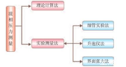 目前測量混相壓力的方法如圖3所示。國內外許多專家研究了確定最小混相壓力的方法,包括理論計算和實驗測定。但是,一般的理論計算精確度都不高,而實驗測定方法具有較高的可靠性。實驗測定方法包括細管實驗、升泡儀法及界面張力法等。其中,界面張力法是通過直接測定注氣相與地層原油間的界面張力來確定最小混相壓力,既能觀測到形成混相的狀態(tài),而且操作時間也較短。細管實驗法被認為是最可靠的測量最小混相壓力方法,但細管實驗也有局限性,不能模擬黏性指進、重力超覆等因素,實驗周期長,大約需要7~14天,且實驗工作量大。升泡儀法是直接觀察混相過程,測量周期短,1h可以完成測量,測量結果受人為因素影響嚴重。而界面張力法是通過直接測定注氣相與地層原油間的界面張力來確定最小混相壓力,既能觀測到形成混相的狀態(tài),而且操作時間也較短,僅需5~6h。