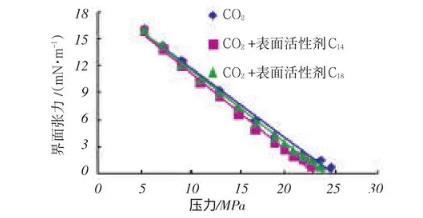 由圖4可知,表面活性劑在一定程度上可以降低原油混相壓力。表面活性劑C14可以降低最小混相壓力接近1MPa,而表面活性劑C18可以降低最小混相壓力接近2MPa,這在理論上可以實現(xiàn)大慶油田二氧化碳混相區(qū)的實現(xiàn),但在降低二氧化碳最小混相壓力方面還需繼續(xù)完善和研發(fā)新型添加劑。對高溫高壓潤濕性及界面張力儀功能擴展為大慶油田二氧化碳驅油研究提供了有利的基礎保障。