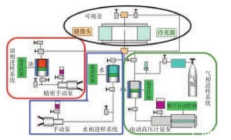 潤濕性及界面張力儀主要包括常溫常壓型、高溫型、超高溫型、便攜型,其中高溫高壓型潤濕性及界面張力儀能夠真實模擬油藏條件測量接觸角和界面張力。為了擴展高溫高壓潤濕性及界面張力儀可以測量二氧化碳與原油最小混相壓力功能,且可以使常溫凝固的稠油等樣品,實現(xiàn)順利進樣測量和測量,需要對現(xiàn)有設備進行改造。通過增加高溫高壓氣體進樣系統(tǒng),改進原有油相、水相進樣系統(tǒng),使其功能得到擴展。