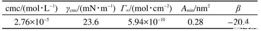 長期以來,在表面活性劑復配應用過程中把烷基季銨鹽CTAB與陰離子型表面活性劑的復配視為禁忌,一般認為兩者在水溶液中相互作用會產生沉淀,從而使表面活性劑失去表面活性。然而,在我們的研究中,發現烷基季銨鹽CTAB與含有聚氧乙烯鏈的陰離子型表面活性劑AES在40°C以上混合時可形成穩定的溶液。由于其親水基間強烈的吸引,該復配體系具有極其優異的表面性質,其cmc低至2.8×10-5mol·L-1,同時γcmc低至23.6 mN·m-1,這兩個重要的表面性質指標均達到常規表面活性劑體系所能達到的最優異的結果。相關的表面性質和β參數經Gibbs吸附公式和規則溶液理論計算后列于表1中。