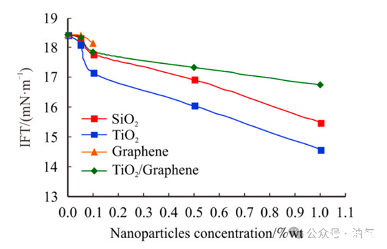 5.單獨(dú)的石墨烯納米顆粒對(duì)降低油水界面張力的影響可以忽略不計(jì)。加之其與TiO2納米顆粒(純TiO2納米顆粒)合成TiO2/石墨烯納米復(fù)合材料時(shí),不利于發(fā)揮作用。因此,石墨烯納米顆粒對(duì)EOR來說在操作上和經(jīng)濟(jì)上都不可行。