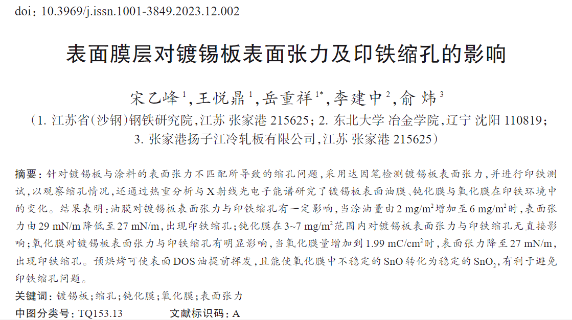 針對鍍錫板與涂料的表面張力不匹配所導致的縮孔問題,采用達因筆檢測鍍錫板表面張力,并進行印鐵測試,以觀察縮孔情況,還通過熱重分析與X射線光電子能譜研究了鍍錫板表面油膜、鈍化膜與氧化膜在印鐵環(huán)境中的變化。