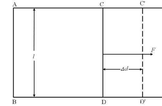 研究液體表面張力隨液體濃度、溫度、壓強等的變化規律的論著很多,卻很少有人研究液體表面張力隨液面拉伸程度的變化規律,從而隱喻了一種結論,即液體在濃度、溫度、壓強等條件不變時,其表面張力的大小不會隨其表面被拉伸的程度而改變。多部專著都有這樣的經典的論述,圖1所示的矩形金屬絲框覆有液膜,其中CD為活動邊,長為l,欲使體系平衡,必須施以適當的力F于CD邊上。CD邊在力F作用下克服液膜表面張力的阻礙而移動距離Δd,對體系做功ΔA=F×Δd,F=2γ×l,γ=F/2l為CD邊的液體表面張力系數。在此論述中,先驗地將液體表面張力視為不隨液膜面積變化而改變的恒量。