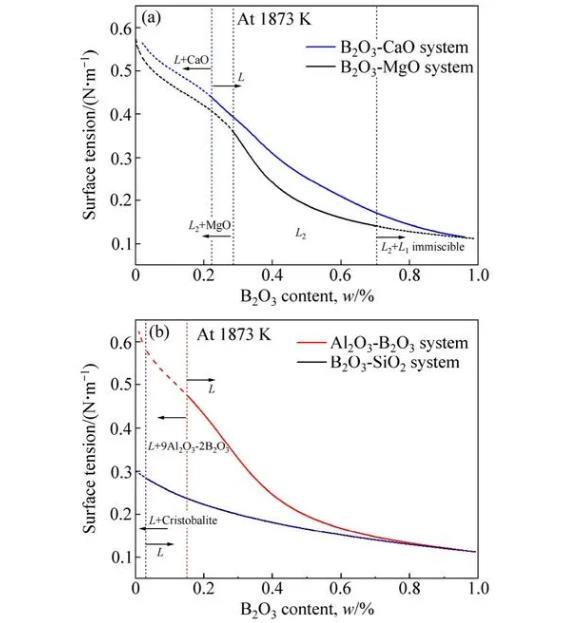 采用本模型計算1873K下含B2O3二元體系熔渣表面張力,考察B2O3含量對熔渣表面張力的影響。MgO-B2O3體系中,1873K時,在富MgO區(B2O3含量(質量分數)小于28%),存在MgO相和液相的固液兩相區(L2+MgO),在富B2O3區(B2O3含量(質量分數)大于70%)存在兩液相不互溶區(L1+L2),且該區處于亞穩態,有關該亞穩態區,其邊界、體系熱力學性質等研究尚不清楚,因此,本研究中雖然計算了MgO-B2O3渣系全濃度范圍內的表面張力變化情況,但僅B2O3含量在28%~70%范圍內熔渣處于單一液相區(L2)范圍;CaO-B2O3體系中,在富B2O3區同樣存在兩液相不互溶區,在不互溶區存在溫度相對較低(<1490℃),因此,1873 K時,僅在富CaO區(B2O3含量小于22%)存在氧化鈣相和液相的固液兩相區(L+CaO)。B2O3-SiO2二元體系中,熔渣液相區(L)范圍比較大,僅富SiO2區(B2O3含量(質量分數)小于3%)存在方英石相和液相的固液兩相區(L+方英石)。Al2O3-B2O3二元體系中,熔渣液相區(L)范圍較窄,僅在富B2O3區(B2O3含量大于85%)存在液相區。含B2O3二元體系熔渣表面張力計算結果如圖2所示。結果表明,作為表面活性物質,B2O3組元能夠顯著降低熔渣表面張力。熔渣表面張力隨著B2O3含量的增加而顯著降低。MgO-B2O3體系和CaO-B2O3體系中,酸性氧化物B2O3的增加,將導致陰離子結構復雜化,陰離子團聚合程度增強,對陽離子的靜電引力減弱,從而降低了體系的表面張力。B2O3-SiO2體系和Al2O3-B2O3體系中,B2O3對表面張力的降低作用,則可能與硼氧陰離子團與硅氧陰離子團、鋁氧陰離子團之間的差異有關。