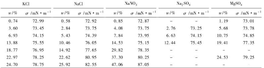 表2 293 K下,無機(jī)鹽的質(zhì)量分?jǐn)?shù)與水溶液界面張力的關(guān)系