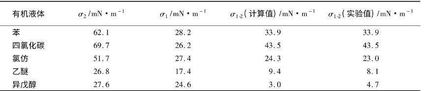 表1給出了幾種有機(jī)液體(油)與水接觸時(shí)的界面張力理論計(jì)算值和實(shí)驗(yàn)測(cè)量值的比較。