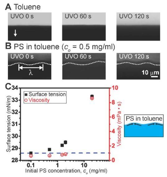 圖 2 (A) 僅通過流涂的甲苯的彎液面前端。 箭頭表示流動后退方向。 (B) 彎月面 聚苯乙烯(PS)在甲苯中通過流涂的前面。 白色的 虛線是眼睛的指南,半月板前面跟隨 k 的周期波長。 (C) 表面張力和粘度作為 初始 PS 濃度的函數。 藍色虛線表示甲苯的表面張力。 示意圖說明 可能由表面張力梯度引起的流動(由 濃度梯度)用于在彎月面蒸發前沿的甲苯中的 PS。