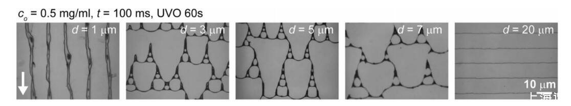 圖 4 PS 模式作為設定距離 d 的函數,具有常數 co (co 5 0.5 mg/mL)、t (t 5 100 ms) 和 UVO 暴露時間 (60 秒)。 白色箭頭表示流動后退方向。