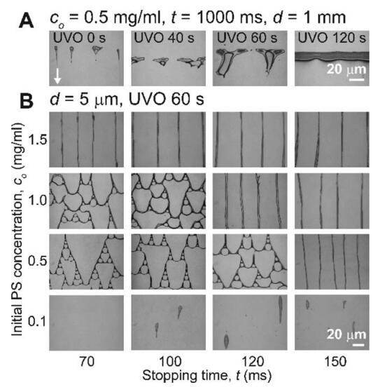 圖 5 (A) PS 圖案作為 UVO 曝光時間的函數 具有恒定的初始 PS 濃度 (co 5 0.5 mg/mL)、停止時間 (t 5 1000 ms) 和設置距離 (d 5 1 mm)。 這 白色箭頭表示流動后退方向。 (二) 聚苯乙烯 模式作為 co 和 t 的函數,同時保持不變 距離 (d 5 5 lm) 和 60 秒的 UVO 曝光時間。