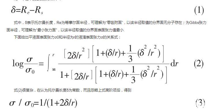 下面給出平液面表面張力σ0和半徑為r的液滴表面張力σ的關系式:
