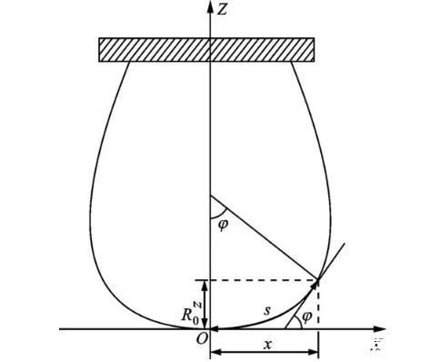 懸滴法利用測定處于重力與表面張力平衡狀態(tài)的液滴外形,獲得待測液體的表面張力。懸滴外形的幾何關(guān)系如圖1所示,在考慮液體靜壓作用的基礎(chǔ)上,由經(jīng)典Young-Laplace方程推導(dǎo)得歸一化Bashforth-Adams工作方程為,式中:σ為表面張力;φ表示外形輪廓線某點切線與橫坐標(biāo)夾角;s為弧長;R0為頂點曲率半徑;ρl、ρg分別表示液相和氣相密度;g代表當(dāng)?shù)刂亓铀俣龋疚娜?.7965 m·s-2。