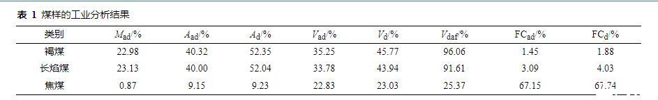 選取不同變質(zhì)程度的褐煤、焦煤及長焰煤,將煤樣放入球磨機中粉碎,并通過篩網(wǎng)過濾出粒徑在0.074 mm(200目)以上的煤粉,置于45℃真空干燥箱中干燥24 h后放入密封袋中低溫、避光保存。利用全自動工業(yè)分析測定儀對3種煤樣的水分、灰分和揮發(fā)分進行測定,計算固定碳,其工業(yè)分析結果如表1所示。