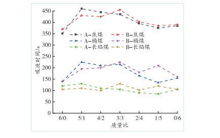 圖6為A、B組復(fù)配溶液與3種煤樣接觸角的對比圖,不同煤樣吸液時間變化情況如圖7所示。