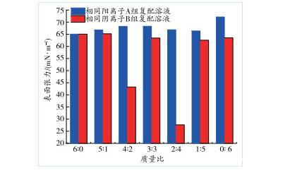 1)與純水相比,復(fù)配后的A、B 2組溶液的表面張力顯著降低,A組復(fù)配溶液的表面張力隨不同復(fù)配質(zhì)量比變化不大,B組復(fù)配溶液的表面張力易受復(fù)配質(zhì)量比變化的影響。