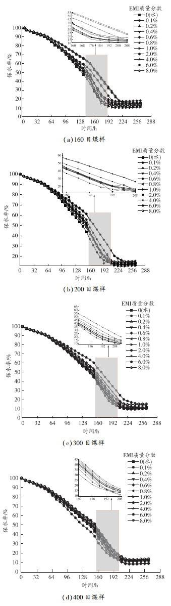 對(duì)比不同質(zhì)量分?jǐn)?shù)EMI溶液對(duì)不同粒徑煤樣保水率的影響曲線(xiàn)(見(jiàn)圖9)可以發(fā)現(xiàn),在160目測(cè)試煤樣中,煤樣在溶液中EMI質(zhì)量分?jǐn)?shù)為1.0%時(shí)靜置,出現(xiàn)了析水現(xiàn)象。相比于160目測(cè)試煤樣,200目和300目測(cè)試煤樣分別在EMI質(zhì)量分?jǐn)?shù)為2.0%、6.0%的溶液中靜置,出現(xiàn)了析水現(xiàn)象。160、200、300目3組測(cè)試煤樣,在EMI質(zhì)量分?jǐn)?shù)小于6.0%的溶液的保水率在216 h后趨于穩(wěn)定,400目測(cè)試煤樣在208 h后趨于穩(wěn)定;而在EMI質(zhì)量分?jǐn)?shù)為6.0%與8.0%溶液中,160、200、300、400目測(cè)試煤樣分別在240、248、232、216 h后保水率趨于穩(wěn)定,穩(wěn)定時(shí)間均大幅提高。說(shuō)明溶液中EMI質(zhì)量分?jǐn)?shù)越高,煤塵的保水效果越好。