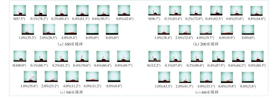 圖4不同質(zhì)量分?jǐn)?shù)EMI的溶液潤(rùn)濕煤塵接觸角成像圖