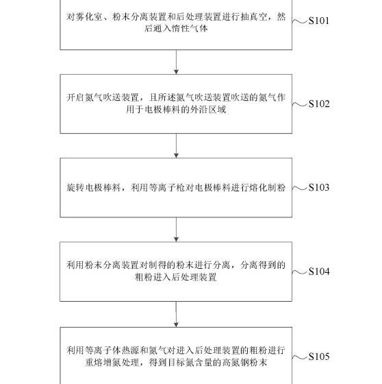 本實施例中,利用氮氣對電極棒料101的外沿區域進行作用,使氮氣與電極棒料101外沿的熔池進行反應,熔池吸氮過程降低了熔池外沿待破碎液膜區域的表面張力,使粉末粒度更小;同時電極棒料101中心區域的液膜移動到電極棒料101外沿時,由于氮氣作用于外沿區域,會繼續對該液膜進行擾動,降低了液膜的表面張力,進而得到粒徑更小的粉末;由于制得的粉末粒徑更小,粉末冷卻速度較快,氮元素析出更少,存留在細粉中的氮含量更高,從而得到氮含量更高的高氮鋼粉末,最終達到制備細粒徑高氮含量的高氮鋼粉末。