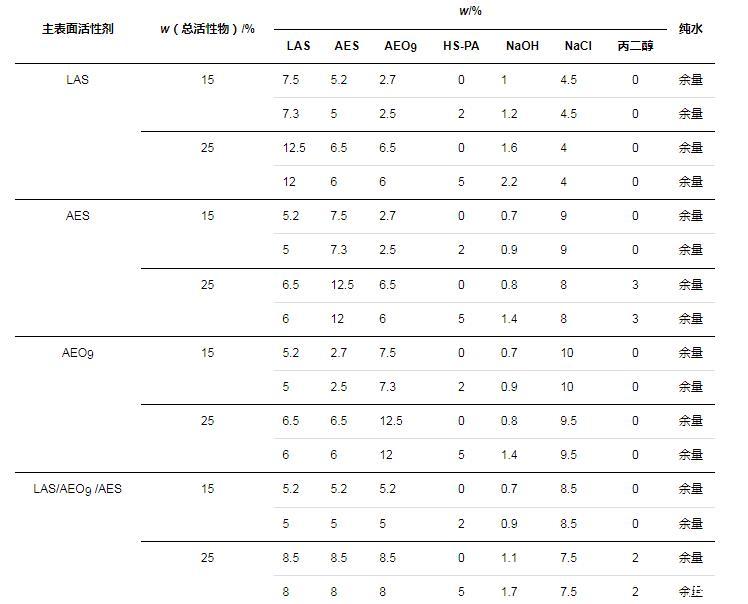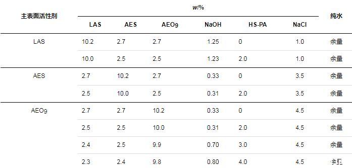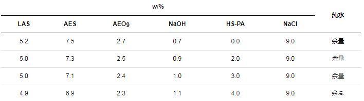 分別考察了在以LAS、AES和AEO9為主要表面活性劑的體系中,HS-PA作為改性聚丙烯酸/酯高分子表面活性劑可發揮的增稠以及去污效果。在配方設計上,總活性物質量分數約為15%。由于HS-PA的增稠作用需要和NaCl協同起效,而不同配方的耐鹽性不同,因此,根據空白組(無HS-PA)配方黏度不反稀的NaCl用量,來確定同組樣品(含HS-PA)的NaCl用量,具體配方如表1所示(表中LAS、AES已換算為純質量分數,HS-PA(w=30%)未換算)。