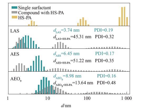 為了探究高分子表面活性劑在水溶液中聚集行為,考察了常規表面活性劑與HS-PA復配前后的膠束粒徑變化。由圖3的結果可知,3種低分子量表面活性劑的聚集體尺寸及分布情況比較相似,其粒徑均小于10 nm,呈現出單峰分布。LAS、AES和AEO9的平均膠束粒徑分別為3.74,6.45和8.98 nm。PDI越大,說明其粒徑分布越寬,高分子表面活性劑HS-PA的PDI大于0.5,其粒徑情況不適合用平均粒徑值表示,因此未在圖中提供平均粒徑的數據。從圖3中HS-PA的粒徑分布情況可以看出,其聚集體為多峰分布,且分布較寬。粒徑為3~5 nm的聚集體可能是HS-PA的單分子膠束。與低分子量表面活性劑不同,在稀溶液中,高分子表面活性劑結構中的疏水鏈段傾向于聚集,分子卷縮,可自身形成單分子膠束,該現象曾被許多研究報道。粒徑為50~110 nm以及650~1 000 nm的為HS-PA的有序多分子聚集體,如膠束、小囊泡等。HS-PA分子量大,分子中的疏水鏈段和親水鏈段長,導致其有序多分子聚集體的粒徑明顯比低分子量表面活性劑大。