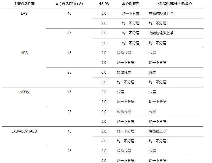 表3不同HS-PA用量的配方(AES為主表面活性劑,總活性物質量分數約為15%)