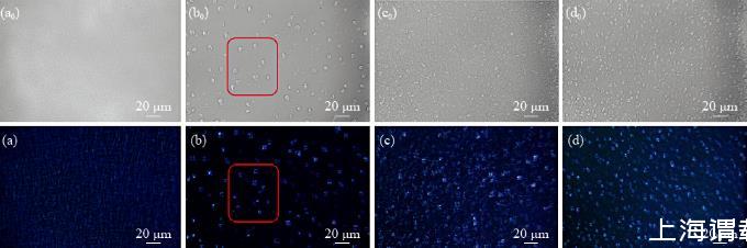 圖6 AES體系中不同HS-PA用量的影響:x0為正常光源下視野,x為偏光條件下視野;a.0%HS-PA;b.2%HS-PA;c.3%HS-PA;d.4%HS-PA