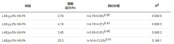 根據Herschel-Bulkley模型擬合的回歸方程及流變參數如表5所示(命名規則:主表面活性劑總活性物質量分數-HS-PA用量),其中擬合曲線相關系數(R2)均不小于0.999,相關性較高,表明LAS體系的流變性可以利用Herschel-Bulkley模型進行研究。在活性物質量分數為15%的體系中添加2%HS-PA,屈服應力從原先的2.78 Pa提高至4.19 Pa,在25%活性物配方中加入5%HS-PA,屈服應力由3.85 Pa提高至25.5 Pa,說明HS-PA的添加可以提高體系的屈服應力。屈服應力是指液晶結構破壞時的臨界剪切應力值。由前文研究結果可知,HS-PA的加入使配方獲得更多更致密的球形層狀液晶,因此,相應地,體系屈服應力也越大。而屈服應力越大,當體系中包含水不溶粒子(如微膠囊)時越容易穩定,該結果與離心測試結果相契合。
