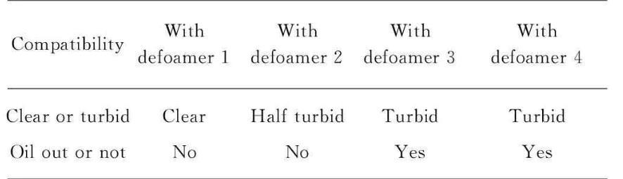 表2是消泡劑與起泡液的相容性。由表2可見:消泡劑1與起泡液有很好的相容性;消泡劑2與起泡液相容性一般。與消泡劑1相比,消泡劑2中的有效成分含量為100%,遠(yuǎn)高于消泡劑1的25%.由此可見,對炔二醇改性的消泡劑與起泡液的相容性與其有效成分是成反比的。由表2還可見,消泡劑3和4與起泡液的相容性都很差,這與油的不相容性有關(guān),加入起泡液中會形成部分乳化和部分漂浮,形成渾濁液。