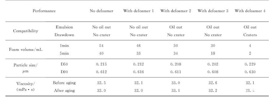 表3消泡劑對水性丙烯酸膠黏劑乳液性能的影響