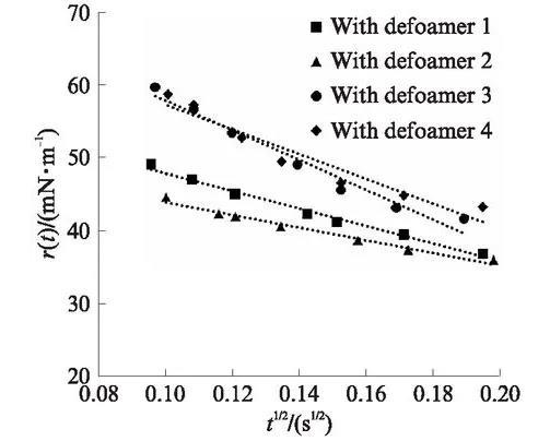 擴(kuò)散系數(shù)是指單位時(shí)間內(nèi)物質(zhì)通過單位擴(kuò)散通道橫截面的質(zhì)量。擴(kuò)散系數(shù)越大,物質(zhì)擴(kuò)散能力越強(qiáng)。利用擬合曲線斜率代入式(1),可以求得消泡劑在起泡液中極短時(shí)間范圍的擴(kuò)散系數(shù),消泡劑1、2、3、4的擴(kuò)散系數(shù)D分別為4.67×10-6、2.43×10-6、1.33×10-5、9.24×10-6m2/s,在10-5到10-6數(shù)量級。