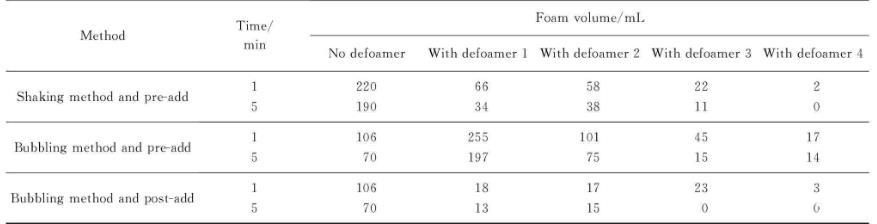 用鼓氣法研究了不同的消泡劑添加方式,由表1可以發(fā)現(xiàn)后添加方式比先添加方式的初始泡沫明顯降低。后添加方式的消泡劑大量聚集于泡沫表面,破壞了氣液界面的平衡。雖然在實(shí)際生產(chǎn)過程中以先添加方式為主,但試驗(yàn)結(jié)果給出了制備工藝改進(jìn)的思路。