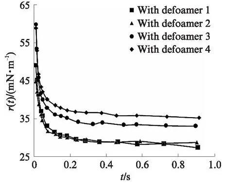 圖1是添加消泡劑后起泡液(0.2%二異辛基琥珀磺酸鈉鹽水溶液)的動態(tài)表面張力r(t)與時(shí)間t的關(guān)系圖。由圖1可以看出:在同樣的添加量下,分子級消泡劑(消泡劑1、2)可使起泡液具有更低的動態(tài)表面張力,這與其雙子結(jié)構(gòu)有關(guān);有機(jī)消泡劑(消泡劑3、4)在起泡物質(zhì)的協(xié)同作用下,也具有一定的降低起泡液動態(tài)表面張力的能力;在起泡液中,不論是加入分子級消泡劑還是有機(jī)消泡劑,在時(shí)間趨于1s時(shí),其表面張力都低于36mN/m.