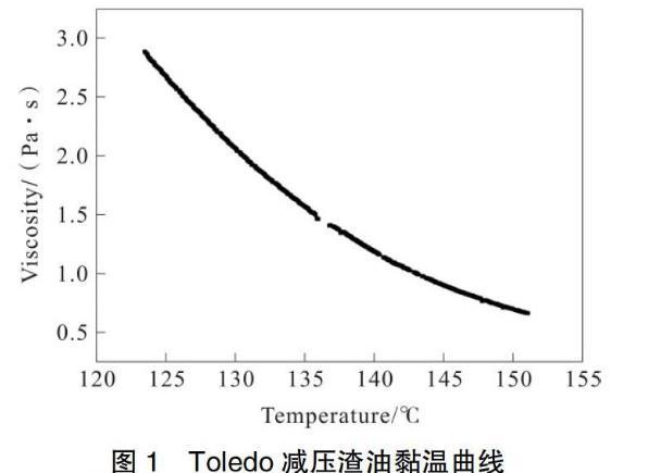 考慮到上述因素,本文在根據(jù)現(xiàn)有儀器測(cè)得的相對(duì)較低溫度條件下的黏溫曲線關(guān)系的基礎(chǔ)上進(jìn)行了減壓渣油較高溫度條件下黏溫關(guān)系的計(jì)算近似,以求對(duì)減壓渣油反應(yīng)模型進(jìn)行較為準(zhǔn)確的理論模型建立的指導(dǎo)。就目前的技術(shù)而言,在缺少直接測(cè)量儀器以及相關(guān)行業(yè)標(biāo)準(zhǔn)的情況下,利用模型進(jìn)行計(jì)算模擬近似,是最具說服性地技術(shù)手段。圖1為實(shí)驗(yàn)室中實(shí)際測(cè)得的在相對(duì)較低溫度下Toledo減渣的黏溫曲線。