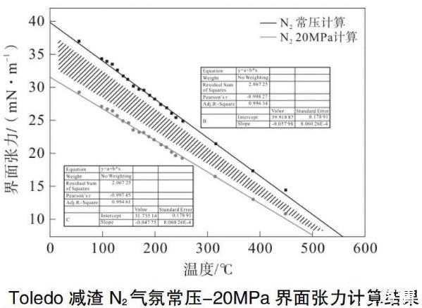 不同溫度條件下的線性下降的斜率與溫度的變化也基本呈現(xiàn)出一定的的線性。另外,對于不同壓力下的界面張力-溫度關(guān)系,理論上應(yīng)當(dāng)都是線性變化,因此,斜率變化的線性變化規(guī)律也是符合一般規(guī)律的。由此可以推測得到在相應(yīng)溫度條件下的線性下降斜率,從而由N2常壓條件下Toledo減渣的界面張力推測得到N2在20 MPa氣氛條件下Toledo減渣的界面張力。