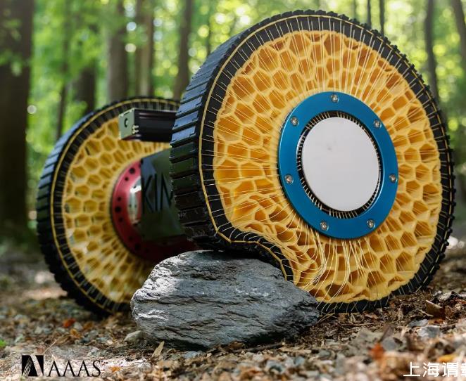這是一個受液滴表面張力啟發的可變剛度輪。在液滴中,隨著最外層液體分子的內聚力的增加,將液體分子向內拉的凈力也增加。這導致高表面張力,導致液滴從引力引起的扭曲形狀恢復為圓形。同樣,車輪的形狀和剛度是通過改變最外層智能鏈塊的牽引力來控制的。隨著連接到每個鏈塊的鋼絲輻條張力的增加,車輪特性反映了一般圓剛輪的特性,這在正常平坦地面上的高速運動中具有優勢。相反,隨著線輻條張力的減小,車輪的模量減小,并且根據障礙物的形狀,車輪容易變形。這使得輪子適合克服障礙物,而不需要復雜的控制或傳感系統。在此機理的基礎上,將輪子應用于重達120 kg的兩輪輪椅系統,實時實現了輪椅在室外環境中駕駛時,圓形高模量狀態和可變形低模量狀態的狀態轉換。