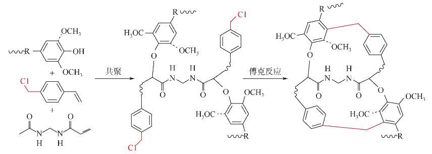 以上文獻表明木質素基多孔聚合物作為吸附劑擁有巨大潛力,但目前報道的木質素基聚合物的比表面積仍相對較小,且多為介孔大孔結構,雜原子含量不高,吸附性能仍有待提高。此外,將其應用于放射性碘捕獲也很少有文獻報道。基于此,本文擬采用多步化學交聯策略,即先通過自由基共聚反應接枝一定量的可烷基化或酰基化基團的芳香族單體,且聚合中加入少量含雜原子的雙烯單體,使其得到理想的親疏水性以及充足的碘親和位點。接著,通過Friedel-Crafts反應使上述內親電試劑在木質素共聚物的大分子鏈之間搭建大量由亞甲基等剛性基團形成的交聯橋,原位構筑剛性結構支撐的雜原子修飾木質素基超交聯聚合物,從而保證其對碘蒸氣或碘溶液具有快速的吸附速率、良好的穩定性和高的吸附容量。