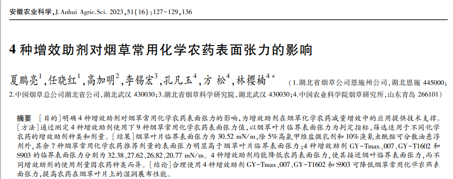 [結論]合理使用4種增效助劑GY-Tmax、007、GY-T1602和S903可降低煙草常用化學農藥表面張力,提高農藥在煙草葉片上的濕潤展布性能。