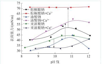 應用鉑片法對溶液表面張力進行測試,測試前使用乙醇和去離子水對測試玻璃皿進行清洗,直至測定去離子水表面張力為72±0.2 mN/m。通過NaOH調節38 mL CaCl2溶液pH值,2 mL 4×10-3 mol/L脂肪酸鈉溶液被添加到CaCl2溶液并攪拌2 min,測量并記錄pH值,然后測量溶液表面張力。