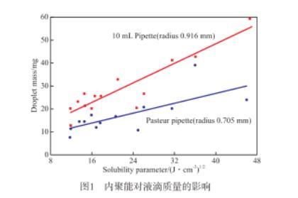 對于純物質的溶解度參數(shù)可通過文獻查閱、基團貢獻計算法和液體熱力學關系式計算。而礦物油為混合物,很難查到或者估算它的溶解度參數(shù)。文獻提供了一種溶解度參數(shù)的估算法:稱量10~20滴液體,然后計算每滴液體的平均質量;另取2種已知溶解度參數(shù)的非揮發(fā)性液體作為參照,通過做圖大致計算出液體的溶解度參數(shù)。實驗需保持恒溫。分別通過內徑為0.916 mm的10 mL移液管和內徑為0.705 mm的巴斯德移液管移取液滴,得到兩條溶解度參數(shù)與液滴質量的關系曲線。內聚能對液滴質量的影響見圖1。由圖1可見,液滴的質量與液體溶解度參數(shù)成線性關系。該估算方法可用來計算混合液體的溶解度參數(shù),適用于礦物潤滑油溶解度參數(shù)的計算。雖然估算方法過于粗糙,但為估算礦物油等復雜混合物的溶解度參數(shù)提供了思路。文獻介紹了液滴的大小與液體表面張力有關。由此可見,溶解度參數(shù)與表面張力存在一定的關系。