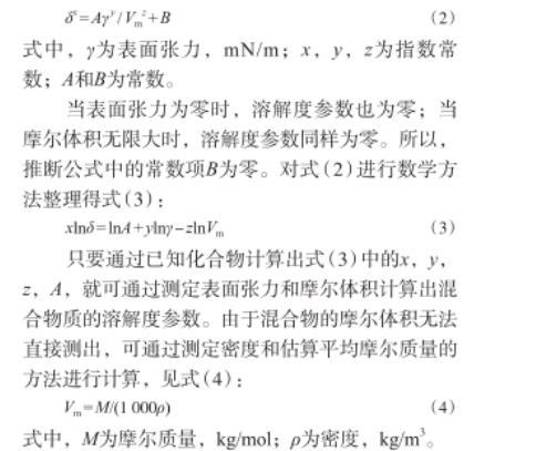 只要通過已知化合物計算出式(3)中的x,y,z,A,就可通過測定表面張力和摩爾體積計算出混合物質的溶解度參數(shù)。由于混合物的摩爾體積無法直接測出,可通過測定密度和估算平均摩爾質量的方法進行計算,見式(4):