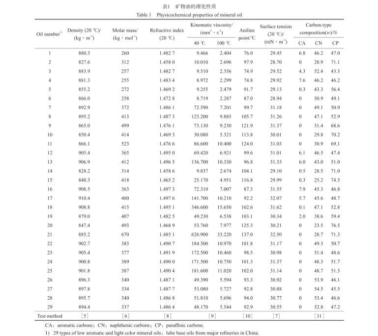 29種常見的低芳淺色礦物油:取自國內主要煉油廠的潤滑油基礎油,包括主要的石蠟基基礎油和環(huán)烷基基礎油,不包括深色高芳烴礦物油;從精制程度看,包括高壓加氫深度精制油品,也包括溶劑精制和白土精制工藝精制油品;從碳型結構看,包括芳環(huán)碳(CA)含量為零的油品,也包括CA含量小于10%(w)的油品。礦物油的理化性質見表1。