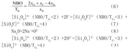 熔體表面張力與熔渣結構的聚合程度密切相關。連鑄結晶器保護渣屬于硅酸鹽,硅酸鹽熔體中含有不同聚合程度的硅氧陰離子團。熔渣結構的聚合程度用符號“NBO/TSi”表示,其計算公式如式(4)所示。NBO/TSi值越小,說明熔體聚合程度越高。將預熔渣和靜滴法測定后的渣樣成分分別帶入到式(6)中,計算結果如表2所示。從表中可以看出,靜滴法測定后渣樣的NBO/TSi值小于預熔渣的NBO/TSi值,說明靜滴法測定后的渣樣熔體結構聚合程度高于預熔渣熔體結構聚合程度。這是由于F-能降低熔渣結構的聚合程度,將高聚合程度的硅氧陰離子團逐漸解聚成低聚合程度的硅氧陰離子,同時Na2O電解出O2-,O2-的出現亦可降低熔體的聚合程度,反應式見(7)~(9):