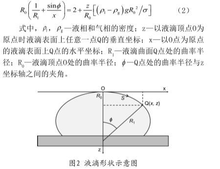 式中,ρl,ρg—液相和氣相的密度;z—以液滴頂點O為原點時液滴表面上任意一點Q的垂直坐標;x—以O點為原點的液滴表面上Q點的水平坐標;R1—液滴曲面Q點處的曲率半徑;R0—液滴頂點O處的曲率半徑;φ—Q點處的曲率半徑與z坐標軸之間的夾角。