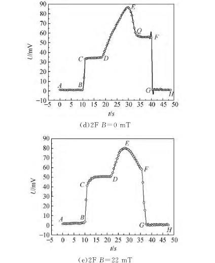 使用拉脫法測量了磁性液體的磁表面張力,無外加磁場作用時,磁性液體的表面張力小于其載液的表面張力,磁性液體液膜拉得更長,液膜收縮的趨勢比白油更明顯,這主要是因為磁性液體中加入的表面活性劑降低了其表面張力。由液膜拉脫過程電壓變化曲線可觀察到:不同條件下磁性液體的電壓變化情況不同,無外加磁場作用時2F號磁性液體在EF階段存在轉折點Q,越過轉折點,QF階段電壓變化較平緩,且表面張力越小;而7#白油和1F磁性液體并未出現此現象,這主要是因為7#白油和1F磁性液體表面張力較大,2F號磁性液體由于表面張力較小,其液體分子與分子之間的作用力較弱,宏觀表現為拉脫的液膜更長,液膜在空氣中會存在一段時間。有外加磁場作用時,2F號磁性液體在FG階段并未出現電壓變化平緩的中間過程,但FG階段出現了另一些數據點,液膜破裂的時間大于無外加磁場作用時的時間,主要是由于外加磁場增強了磁性顆粒之間的相互作用,分子和分子之間的磁吸引力增強,導致液膜逐步破裂。