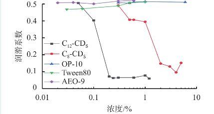 表面活性劑濃度是影響體系潤滑性能的重要原因之一。單一濃度無法全面系統地評價表面活性劑的潤滑性能,因此,進一步探究表面活性劑濃度對潤滑性能的影響,測定了不同濃度的5種表面活性劑在硅酸鈉水溶液中的潤滑系數,如圖1所示。