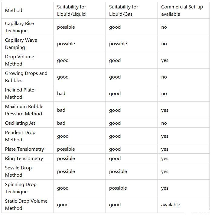 為了克服這個問題,Joos提出了一個理論,將動態(tài)方法的數(shù)據(jù)減少到所謂的界面有效壽命,相當于靜態(tài)界面達到吸附狀態(tài)所需的時間。這樣就可以直接比較所有實驗技術的測量結果。每種方法都有優(yōu)點和缺點。