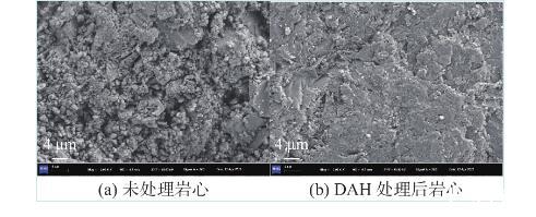 將打磨好的未處理巖心和防水鎖劑DAH處理后的巖心采用掃描電鏡進行測試,結果如圖9所示。由圖9(a)可知,未處理的巖心表面較為粗糙,存在較多大顆粒與微孔隙,在親水礦物和毛細管力的綜合作用下,巖心表面呈親水性。如圖9(b)所示,DAH處理后的巖心表面更為光滑,微孔隙數目減少,這是因為防水鎖劑中的DAT分子通過靜電作用在巖心表面吸附形成薄膜。DAT分子兩端的季銨結構可以通過靜電作用吸附在砂巖表面,中間的聚硅氧烷鏈段具有良好的柔韌性和旋轉靈活性,使得DAT分子可以在巖心表面密集覆蓋。同時聚硅氧烷鏈段的柔韌性也使其兩側的甲基可以高密度堆積,這種堆積使得巖心表面獲得較強的疏水性,從而降低了液相返排阻力,減輕了水鎖損害。
