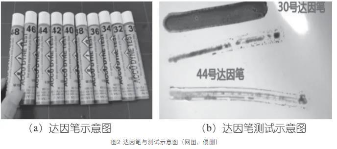測試前先確定環(huán)境溫度、空氣濕度、以及被測物體表面溫度是否達(dá)到達(dá)因筆標(biāo)定的標(biāo)準(zhǔn)條件(溫差越大,測量誤差越大)。測試方法圖2(b)所示塑料袋張力測試,當(dāng)30mN/m筆測試時(shí),在2 s內(nèi)達(dá)因筆潤濕了基材表面,沒有收縮或分散情況,說明表面張力等于或大于30 mN/m;當(dāng)44 mN/m筆測試時(shí),在2 s內(nèi)達(dá)因筆沒有潤濕了基材表面,出現(xiàn)收縮或分散水珠情況,說明表面張力小于44 mN/m。還可用大于30 mN/m筆測量,以此類推,直到測試結(jié)果在2 s內(nèi)改縮成水珠(球狀),則這測試之前一次的值被視為基材表面能,并作比較用。塑料袋PP材質(zhì)在溫度20℃時(shí)表面張力是31~33 mN/m。達(dá)因筆使用方便,保質(zhì)期為6個(gè)月。
