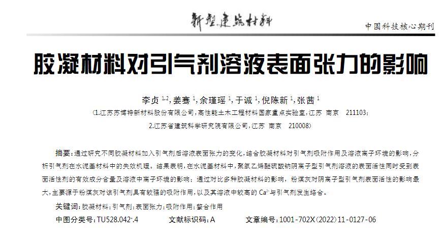 通過研究不同膠凝材料加入引氣劑后溶液表面張力的變化,結合膠凝材料對引氣劑吸附作用及溶液離子環境的影響,分析引氣劑在水泥基材料中的失效機理。結果表明,在水泥基材料中,聚氧乙烯醚硫酸鈉陰離子型引氣劑溶液的表面活性同時受到表面活性劑的有效成分含量及溶液中離子環境的影響;通過對比多種膠凝材料的影響,粉煤灰對陰離子型引氣劑表面活性的影響最大,主要源于粉煤灰對該引氣劑具有較強的吸附作用,以及其溶液中較高的Ca2+與引氣劑發生絡合。